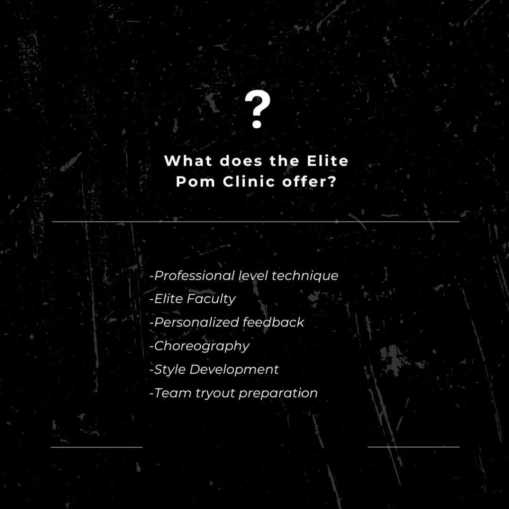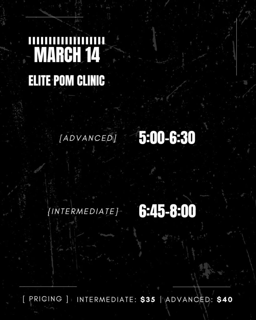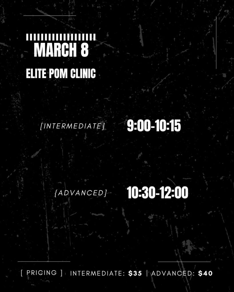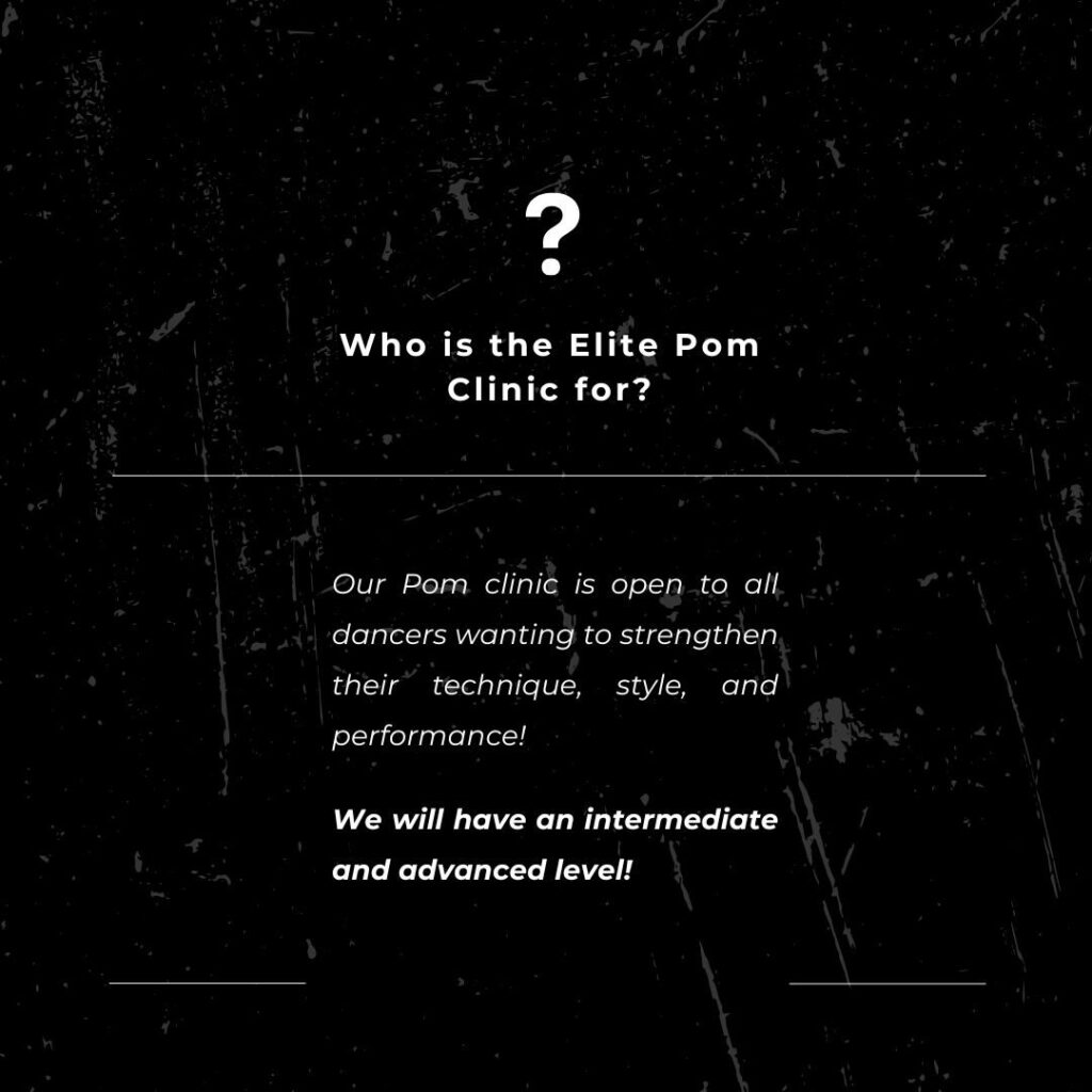 Our Elite Pom clinic is designed to refine your technique, enhance your performance quality, and boost your confidence! This clinic is for dancers looking to prepare for High School and Collegiate pom team tryouts and various audition opportunities!