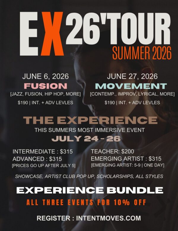 An in-studio Experience event that offers intermediate and advanced movers the opportunity to train with Elite Faculty in all immersive styles. This event gives movers an inside-look at INTENT’s Training Program through mentorship, training, and artistic development.