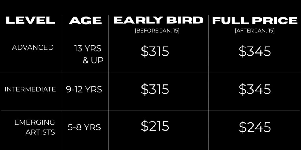 Designed for dancers to share their creativity and  express their own interpretation of  choreography and musicality. Dancers will learn the art of phrasing during Saturday classes. Attendees who sign up for the competition will perform individually at the end of our Saturday showcase, and winners will receive a reward and recognition.